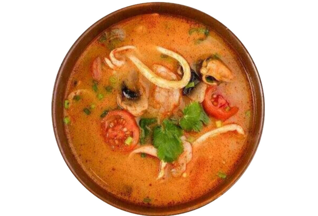 Бульон Том Ям на какосовом молоке с форелью, тилапией, креветками, кальмарами, мидиями, шампиньонами, черри. Подается с рисом, кунжутом и лимоном.