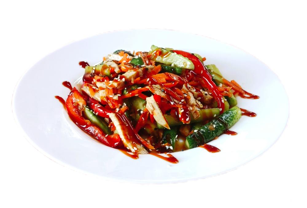Куриное филе, огурец, перец болгарский, морковь-ча, чеснок, соус соевый, бальзамический соус, кунжутные семечки